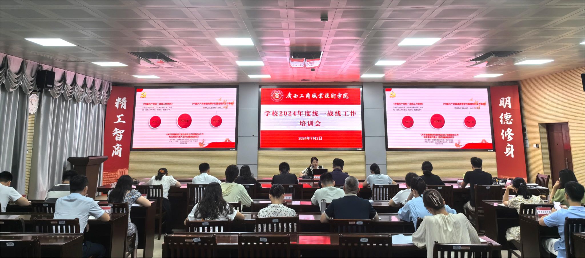 7月3日,學(xué)校在鵬飛校區(qū)召開(kāi)2024年統(tǒng)一戰(zhàn)線工作培訓(xùn)會(huì),黨委統(tǒng)戰(zhàn)部部長(zhǎng)李筱翎同志主持會(huì)議并作培訓(xùn)。學(xué)校各黨總支、各直屬黨支部統(tǒng)戰(zhàn)委員、黨委統(tǒng)戰(zhàn)部全體人員參加會(huì)議。