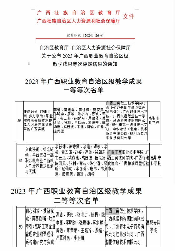 近期,自治區(qū)教育廳自治區(qū)人力資源和社會(huì)保障廳公布2023年廣西職業(yè)教育自治區(qū)級(jí)教學(xué)成果等次評(píng)定結(jié)果,我院以第一完成單位榮獲自治區(qū)級(jí)教學(xué)成果獎(jiǎng)3項(xiàng),其中一等等次2項(xiàng)和二等等次1項(xiàng)。