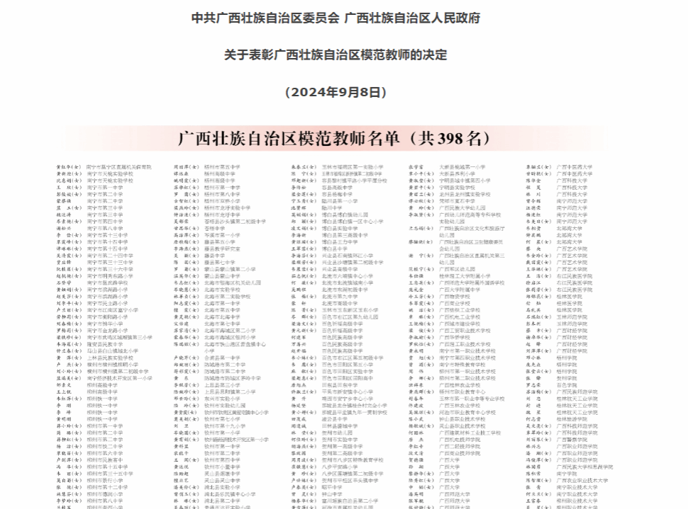 9月8日,自治區(qū)黨委、自治區(qū)人民政府決定,授予398名個人“廣西壯族自治區(qū)模范教師”稱號,我校教師張煌強、高潔獲此稱號。