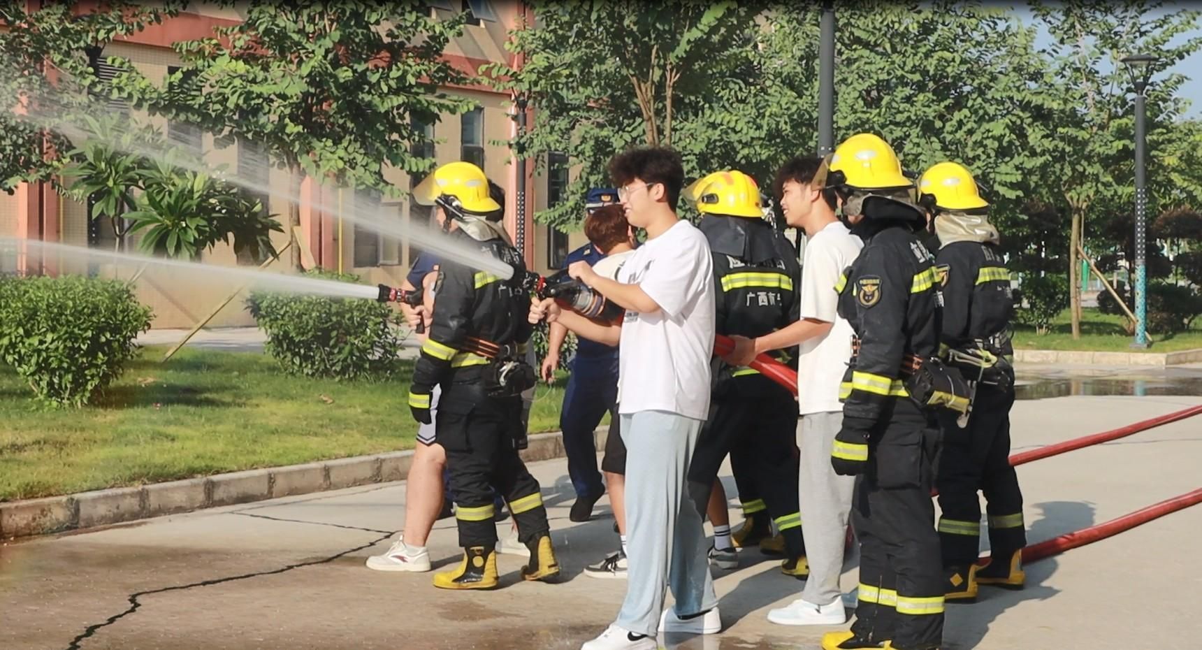 講座結(jié)束后還開展了消防實戰(zhàn)演練活動,消防隊員為新生們介紹了滅火器的分類和使用方法,指導(dǎo)滅火器實際操作,并演示了高壓水槍滅火的操作。