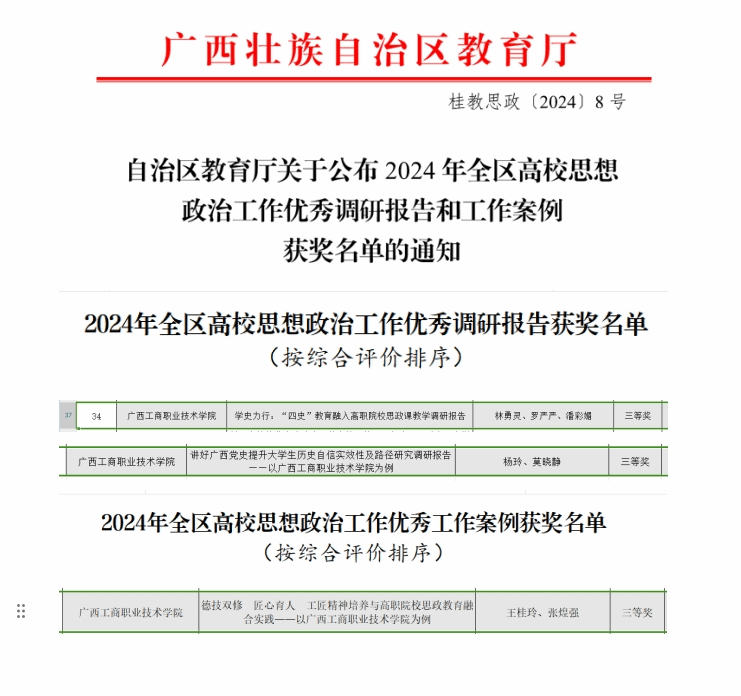 林勇靈、羅嚴(yán)嚴(yán)、潘彩媚的《學(xué)史力行:“四史”教育融入高職院校思政課教學(xué)調(diào)研報(bào)告》和楊玲、莫曉靜的《講好廣西黨史提升大學(xué)生歷史自信實(shí)效性及路徑研究調(diào)研報(bào)告——以廣西工商職業(yè)技術(shù)學(xué)院為例》榮獲2024年全區(qū)高校思想政治工作優(yōu)秀調(diào)研報(bào)告三等獎(jiǎng)。王桂玲、張煌強(qiáng)的《德技雙修 匠心育人 工匠精神培養(yǎng)與高職院校思政教育融合實(shí)踐——以廣西工商職業(yè)技術(shù)學(xué)院為例》榮獲2024年全區(qū)高校思想政治工作優(yōu)秀工作案例三等獎(jiǎng)。