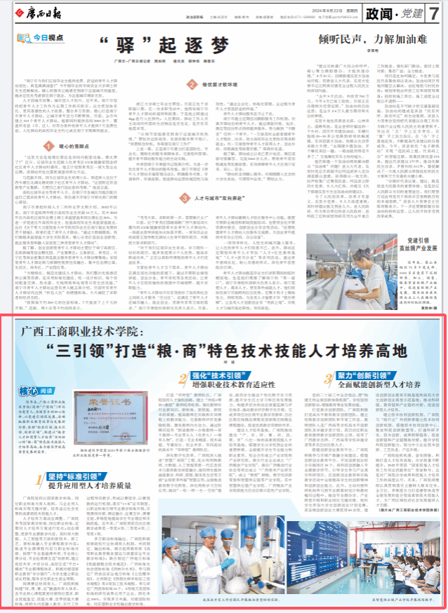 2024年8月22日出版的《廣西日報》刊發(fā)學(xué)校校長劉進署名文章《廣西工商職業(yè)技術(shù)學(xué)院: “三引領(lǐng)”打造“糧·商” 特色技術(shù)技能人才培養(yǎng)高地》,全文如下。