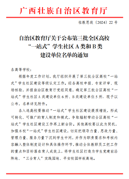 近日,自治區(qū)教育廳公布第三批全區(qū)高?!耙徽臼健睂W生社區(qū)A類和B類建設(shè)單位名單,我校經(jīng)申報、專家評審、現(xiàn)場核驗并報自治區(qū)教育廳黨組同意,被確定為第三批全區(qū)高?!耙徽臼綄W生社區(qū)A類建設(shè)單位。