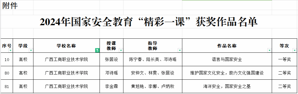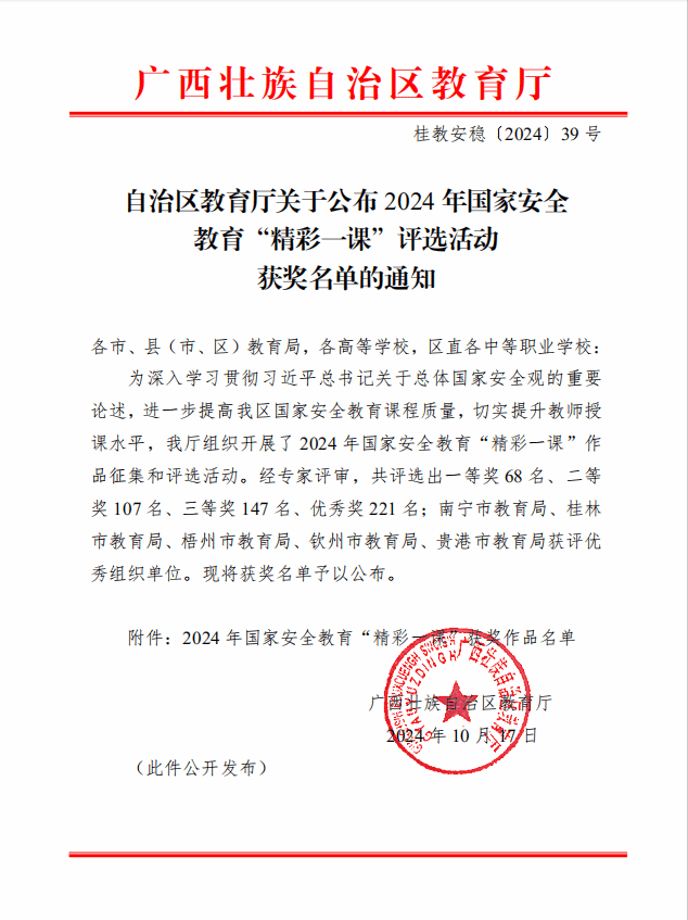 近日,自治區(qū)教育廳公布2024年國(guó)家安全教育“精彩一課”評(píng)選活動(dòng)獲獎(jiǎng)名單,我校所有參賽作品均獲獎(jiǎng)。其中張居設(shè)老師主講的《語(yǔ)言與國(guó)家安全》(指導(dǎo)教師:陳寧春、陸長(zhǎng)英、鄧詩(shī)瑤)榮獲一等獎(jiǎng)、鄧詩(shī)瑤老師主講《維護(hù)國(guó)家文化安全,助力文化強(qiáng)國(guó)建設(shè)》(指導(dǎo)教師:安仲文、林雯、張居設(shè))和李金霖老師主講《海洋安全,國(guó)家安全之基》(指導(dǎo)教師:黃旭艷、李娜、盧炳秋)榮獲二等獎(jiǎng)。