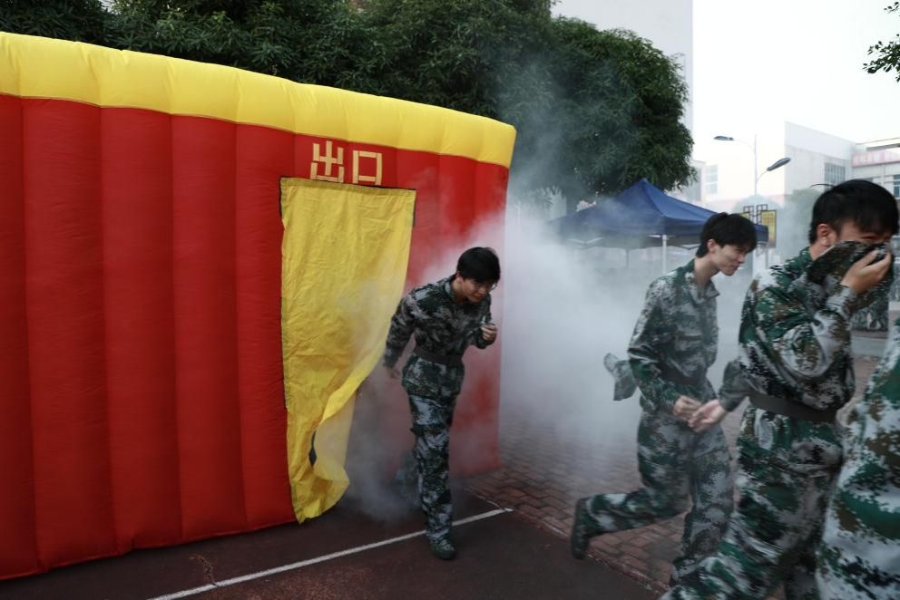 中午14:30,疏散演練開(kāi)始,學(xué)生公寓模擬起火點(diǎn)開(kāi)始點(diǎn)煙,火災(zāi)警報(bào)聲立即拉響。各公寓樓從高到低逐層疏散,在引導(dǎo)員的指引下,全體師生用毛巾捂住口鼻,沿著疏散通道采用彎腰低頭的姿勢(shì),有序地疏散至安全地帶。
