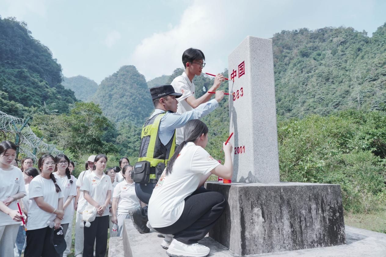 在邊境線上,師生們沿著崎嶇不平的山路,在金龍鎮(zhèn)邊境警官們的帶領(lǐng)下開啟了一場意義非凡的巡邊體驗。這段艱難的路程不僅是一次身體上的考驗,更是對意志力的一次磨煉,讓大家深刻體會到守護(hù)邊境安全的戰(zhàn)士們每日巡邏所付出的艱辛。當(dāng)一步步靠近883號界碑時,每個人的內(nèi)心都充滿了激動與自豪。通過黃警官的詳細(xì)講解,大家對883號界碑有了更深入的了解,對其背后的意義也有了更加清晰的認(rèn)識。在界碑前,全體師生一起重溫了入團(tuán)誓詞,鏗鏘有力的“為共產(chǎn)主義事業(yè)而奮斗”誓言回蕩在邊境上空,表達(dá)了新時代青年守好祖國南大門的堅定決心。