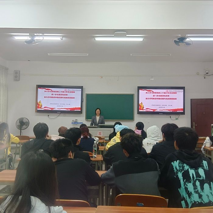 12月6日,學(xué)校黨委副書記、紀(jì)委書記韋云鳳深入思政課課堂,以《深入學(xué)習(xí)貫徹黨的二十屆三中全會(huì)精神 進(jìn)一步全面深化改革 奮力書寫推進(jìn)中國(guó)式現(xiàn)代化的青春篇章》為主題,向廣告2410班同學(xué)講授專題課。