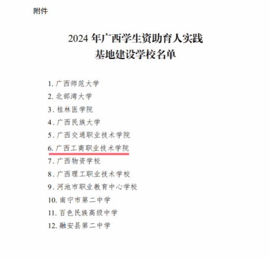 近日,自治區(qū)教育廳發(fā)布了《自治區(qū)教育廳關于公布2024廣西學生資助育人實踐基地建設學校名單的通知》,我校獲評第二批廣西高校資助育人實踐示范基地建設高校。這標志著我校在資助育人平臺建設上取得新的突破,也是學校資助育人工作質量不斷提升的重要體現(xiàn)。