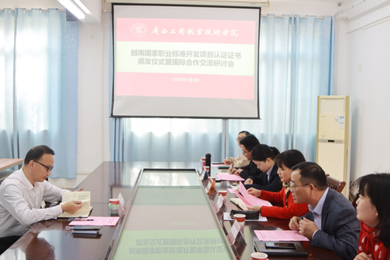 1月6日,學校在鵬飛校區(qū)舉辦越南國家職業(yè)標準共建項目認證證書頒發(fā)儀式暨國際合作交流研討會。學校教務處處長覃遠霞、經貿學院院長張煌強以及標準研發(fā)團隊主要成員代表,越南國家職業(yè)標準項目秘書處代表武漢叁壹教育科技有限公司副總經理李劍參加了會議。
