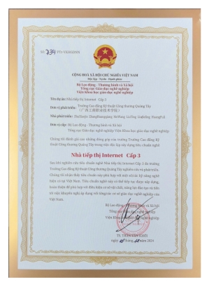 據悉,為推動中越兩國職業(yè)教育交流與合作,廣西現(xiàn)代東盟教育研究院組織發(fā)起了“越南國家職業(yè)標準共建項目”。我校經貿學院項目團隊充分發(fā)揮市場營銷高水平專業(yè)群的優(yōu)勢,于2024年7月份答辯獲批立項獨立開發(fā)互聯(lián)網營銷師3級標準。立項后便進入了緊張的建設階段,經過共同努力,在學校及各方的支持下,項目團隊于2024年12月成功完成了“互聯(lián)網營銷師”3級職業(yè)標準的建設,并順利通過驗收,獲得了越南勞動榮軍社會部職業(yè)教育總局職業(yè)教育科學研究院頒發(fā)的職業(yè)標準證書。該職業(yè)標準將繼續(xù)被開發(fā)和完善,以確保該標準具備實施和培訓條件,并向越南各職業(yè)教育機構推廣應用。這一成果標志著我校市場營銷高水平專業(yè)群在打造面向東盟的職業(yè)教育開放合作新高地的目標上又堅實地邁進了重要一步。