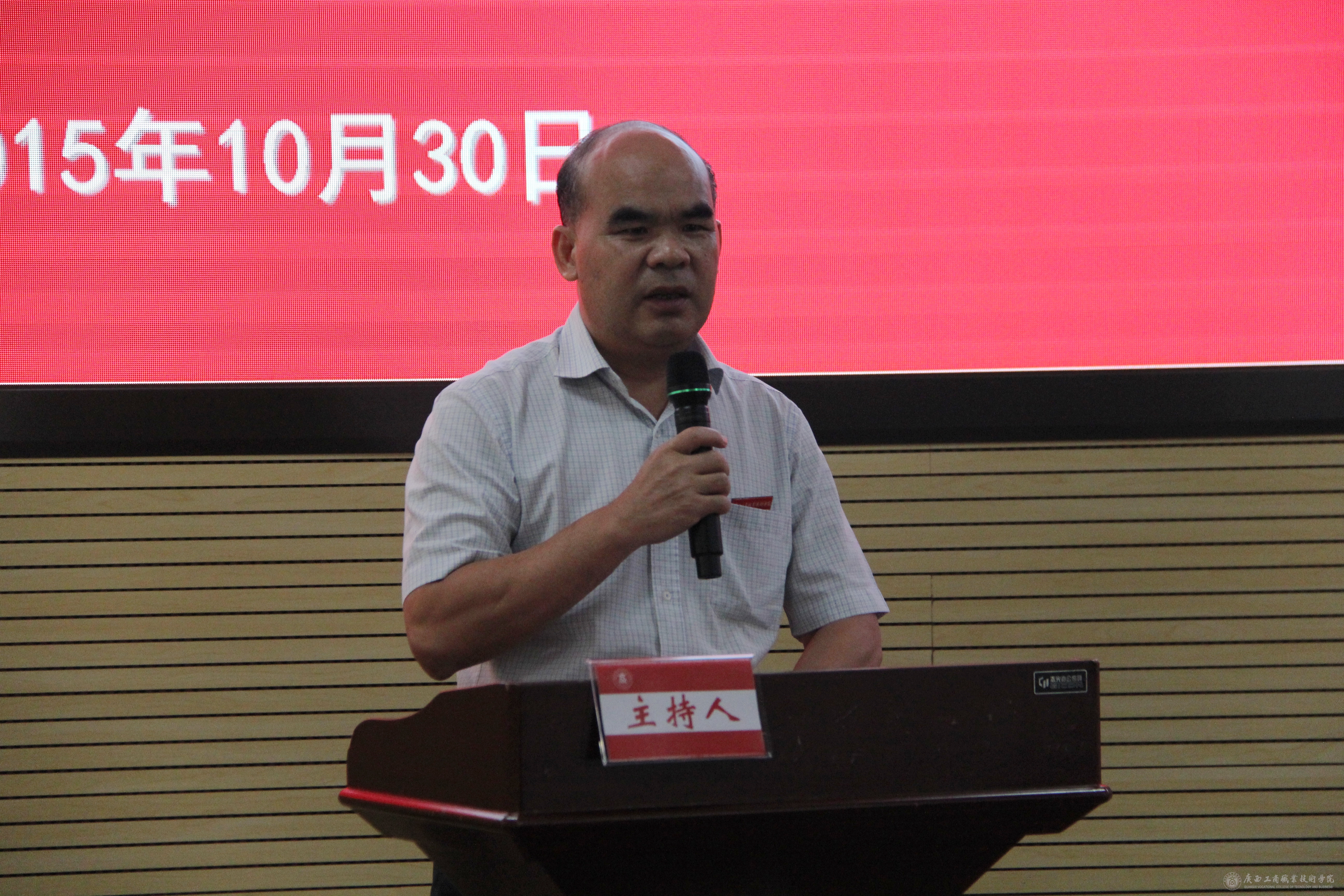 2015年10月30日下午,我院邀請(qǐng)自治區(qū)糧食局吳宇雄局長(zhǎng)作“三嚴(yán)三實(shí)”專題報(bào)告。報(bào)告會(huì)在我院校本部2119 會(huì)議室舉行。學(xué)院黨委書(shū)記覃武云、黨委副書(shū)記蒙啟成、副院長(zhǎng)李仕欽、副廳級(jí)調(diào)研員黃永蓬、自治區(qū)糧食局辦公室副主任朱其俊,以及我院副科級(jí)以上干部、社科部全體教職工和學(xué)生干部代表參加了報(bào)告會(huì),報(bào)告會(huì)由覃武云書(shū)記主持。