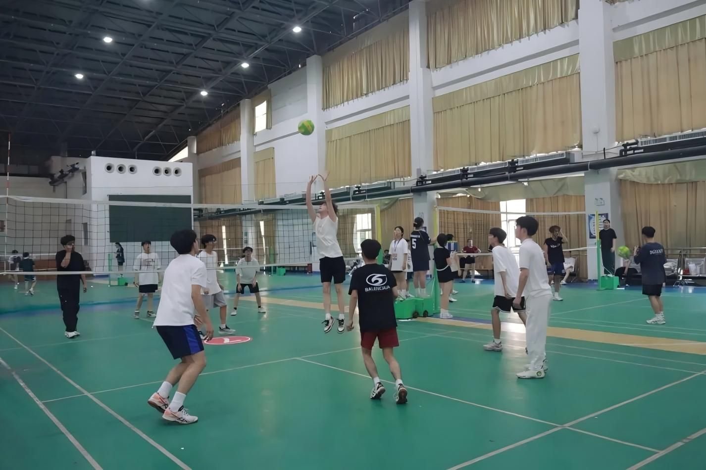 在排球比賽中,隊員們展現(xiàn)了出色的默契,無論發(fā)球、攔網(wǎng)還是扣球,都顯得非常熟練。觀眾的助威聲和加油聲不斷為隊員們提供動力。每次精彩得分都伴隨著熱烈的掌聲和歡呼,賽場氣氛緊張而激動。