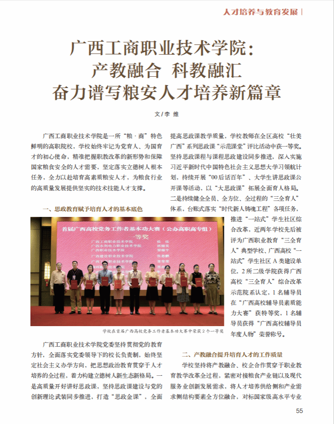 近日,《中國糧食經濟》刊發(fā)學校黨委書記李維署名文章,標題為《廣西工商職業(yè)技術學院:產教融合 科教融匯 奮力譜寫糧安人才培養(yǎng)新篇章》,全文如下: