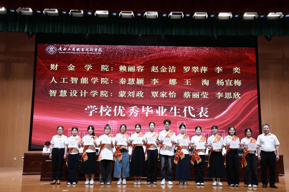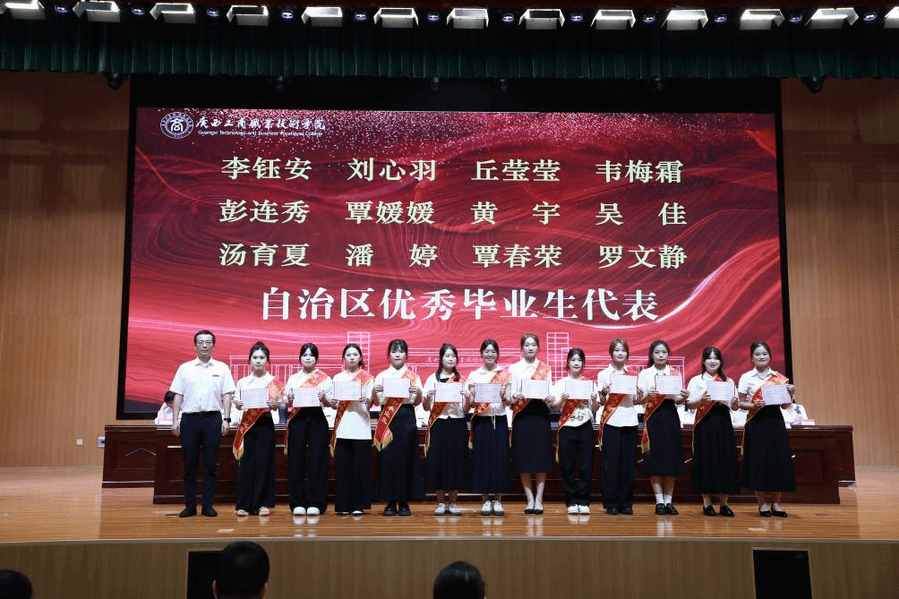 典禮上,闕勇平宣讀2025年畢業(yè)生文件,韋云鳳宣讀優(yōu)秀畢業(yè)生表彰文件,陳寧春宣讀榮獲國(guó)家獎(jiǎng)學(xué)金優(yōu)秀學(xué)生表彰文件。李維為國(guó)家獎(jiǎng)學(xué)金獲獎(jiǎng)學(xué)生代表頒發(fā)榮譽(yù)證書(shū),劉進(jìn)為自治區(qū)級(jí)“優(yōu)秀畢業(yè)生”代表頒發(fā)榮譽(yù)證書(shū)、為畢業(yè)生代表頒發(fā)畢業(yè)證書(shū),韋云鳳、陳寧春、闕勇平、鄭華為校級(jí)“優(yōu)秀畢業(yè)生”代表頒發(fā)榮譽(yù)證書(shū)。