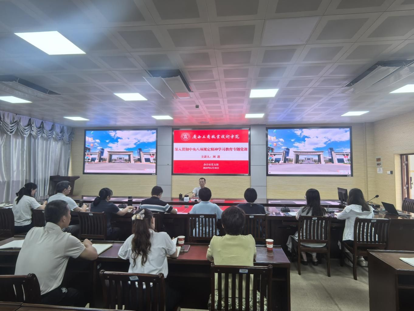 6月30日,學(xué)校黨委副書記、校長(zhǎng)劉進(jìn)到基層黨組織開展深入貫徹中央八項(xiàng)規(guī)定精神學(xué)習(xí)教育專題黨課,學(xué)校辦公室黨支部全體黨員參加活動(dòng)。