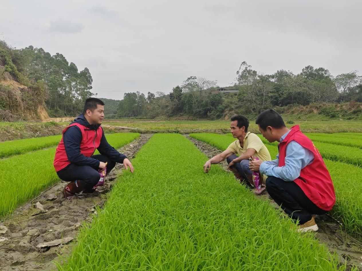 (鐘全和駐村隊員到田地了解水稻秧苗培育情況)