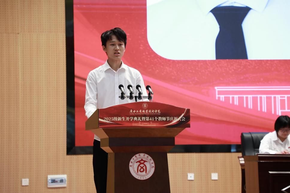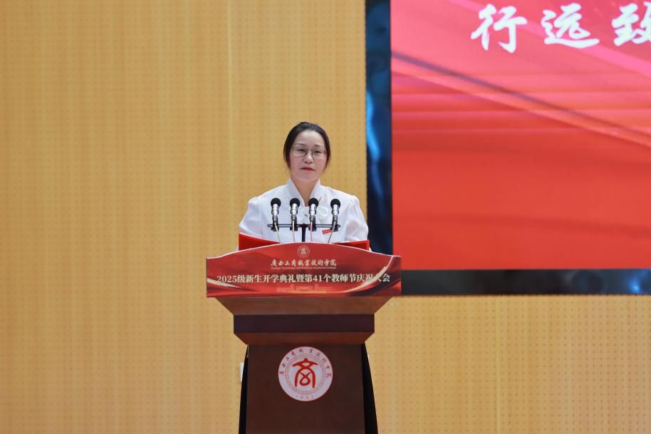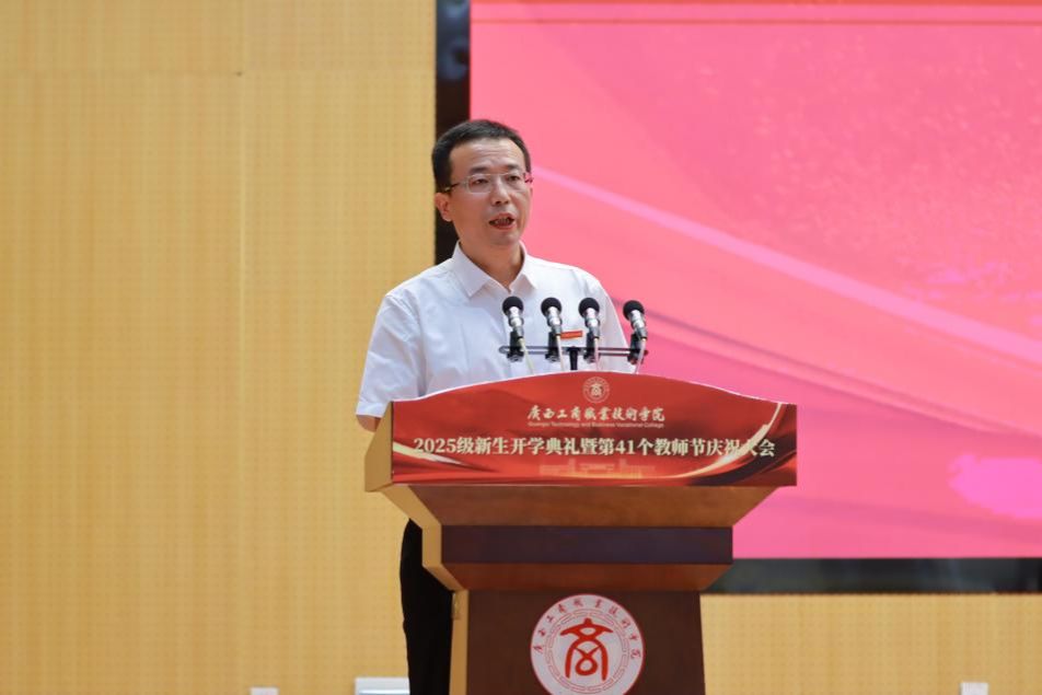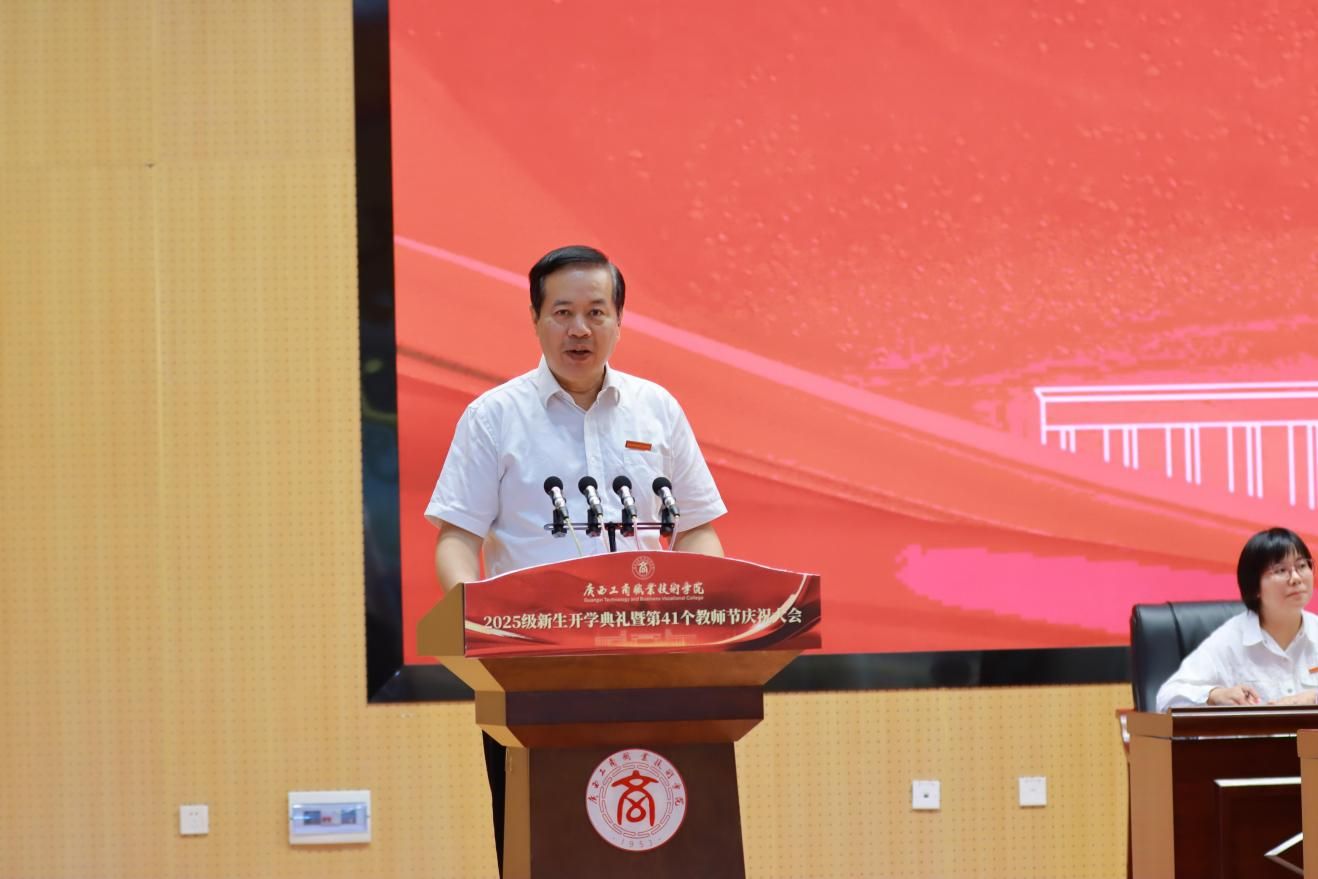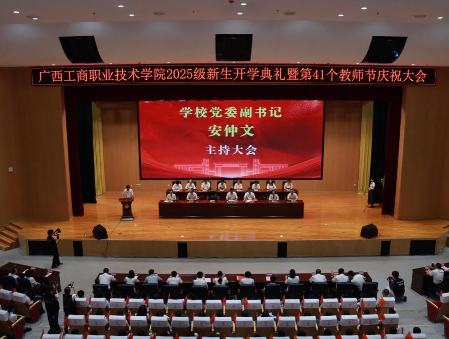 為熱烈歡迎2025級新生入學(xué),隆重慶祝第41個(gè)教師節(jié),9月10日,學(xué)校以線上線下相結(jié)合的方式在武鳴校區(qū)、鵬飛校區(qū)、中堯校區(qū)同步舉行2025級新生開學(xué)典禮暨第41個(gè)教師節(jié)慶祝大會。學(xué)校領(lǐng)導(dǎo)李維、劉進(jìn)、安仲文、韋云鳳、陳寧春、闕勇平、鄭華,各部門、各單位主要負(fù)責(zé)人,受表彰教師代表,新入職教師代表,武鳴校區(qū)2025級輔導(dǎo)員代表和2025級新生代表在線下主會場參會,全體2025級新生及各部門、各單位教職工在線上參會。學(xué)校黨委副書記安仲文主持大會。