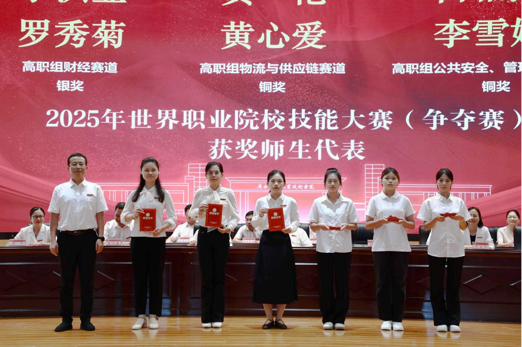 大會對學(xué)校2024年度學(xué)校優(yōu)秀教師和優(yōu)秀教育工作者代表、2025年度學(xué)校教學(xué)能手、2025年度學(xué)校教學(xué)名師、2024年中國國際大學(xué)生創(chuàng)新大賽獲獎(jiǎng)師生代表、2025年世界職業(yè)院校技能大賽(爭奪賽)獲獎(jiǎng)師生代表、2024年度廣西技術(shù)能手進(jìn)行了表彰。