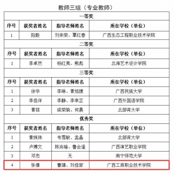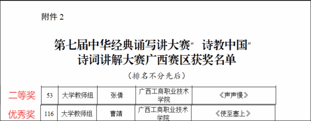 其中,在廣西第十八屆中華經(jīng)典誦讀大賽暨2025廣西校園中華經(jīng)典誦讀大賽大學(xué)生二組獲一等獎(jiǎng)1項(xiàng)、二等獎(jiǎng)1項(xiàng)、三等獎(jiǎng)4項(xiàng),教師三組(非專業(yè)教師)獲一等獎(jiǎng)2項(xiàng)、優(yōu)秀獎(jiǎng)1項(xiàng),教師三組(專業(yè)教師)獲優(yōu)秀獎(jiǎng)1項(xiàng),大學(xué)生集體組獲優(yōu)秀獎(jiǎng)1項(xiàng)。在第七屆中華經(jīng)典誦寫講大賽"詩(shī)教中國(guó)"詩(shī)詞講解大賽(廣西賽區(qū))大學(xué)教師組獲二等獎(jiǎng)1項(xiàng)、優(yōu)秀獎(jiǎng)1項(xiàng)。