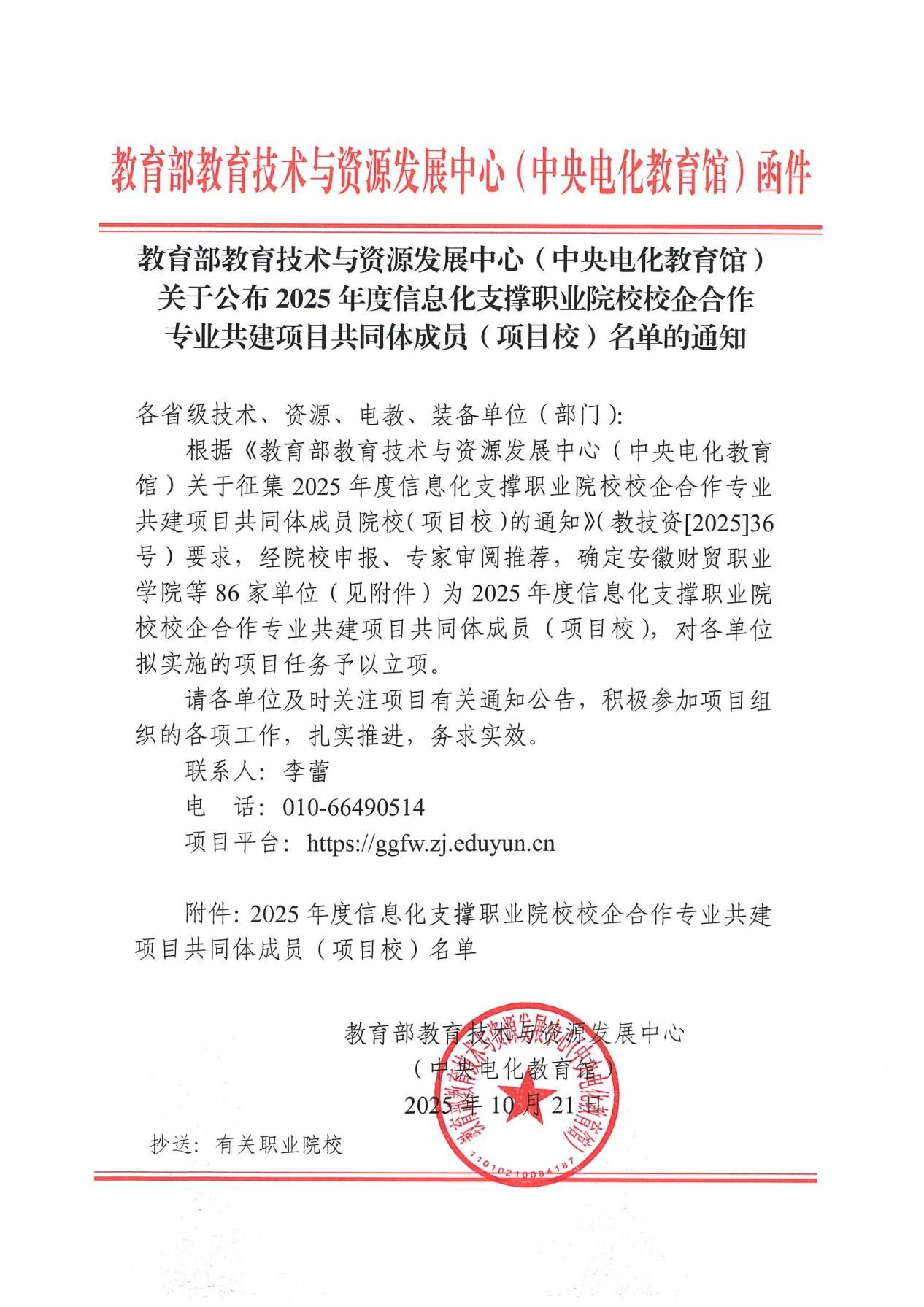 近日,教育部教育技術與資源發(fā)展中心(中央電化教育館)公布2025年度“信息化支撐職業(yè)院校校企合作專業(yè)共建項目”共同體成員名單,經(jīng)過嚴格的資格審查與專家評議,我校成功入選成為項目共同體成員。