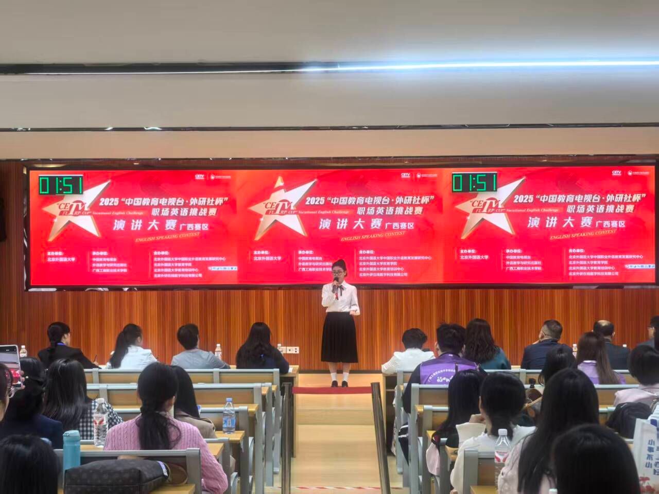 2025年“中國教育電視臺·外研社杯”職場英語挑戰(zhàn)賽廣西賽區(qū)比賽于11月2日順利落幕,本次大賽分為英語演講與英語寫作兩個賽項。11月1日,英語演講賽項在我校成功舉辦。