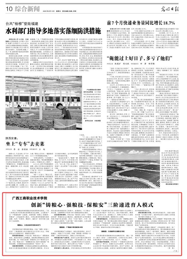 2025年8月15日,《光明日?qǐng)?bào)》刊登學(xué)校黨委書記李維署名文章,標(biāo)題為:《廣西工商職業(yè)技術(shù)學(xué)院創(chuàng)新“鑄糧心·強(qiáng)糧技·保糧安”三階遞進(jìn)育人模式》,全文如下: