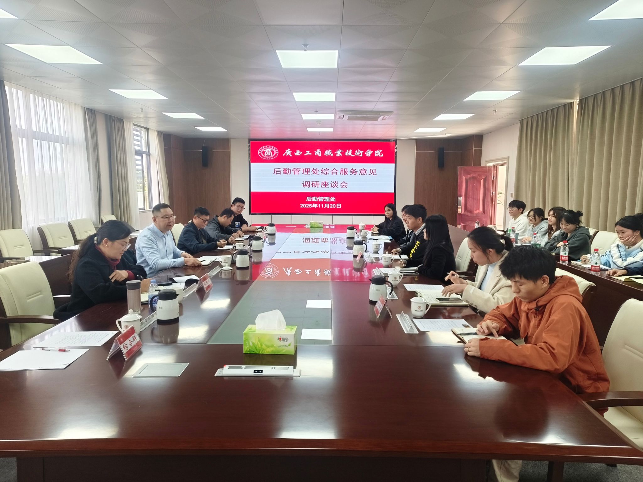 為深入了解師生對(duì)后勤服務(wù)的意見(jiàn),進(jìn)一步提升學(xué)校后勤服務(wù)保障水平,11月20日,學(xué)校副校長(zhǎng)陳寧春在武鳴校區(qū)主持召開后勤服務(wù)意見(jiàn)調(diào)研座談會(huì)。后勤管理處處長(zhǎng)林昆榮、相關(guān)科室工作人員,以及來(lái)自糧油與管理學(xué)院、財(cái)金學(xué)院、會(huì)計(jì)學(xué)院的師生代表參加會(huì)議。