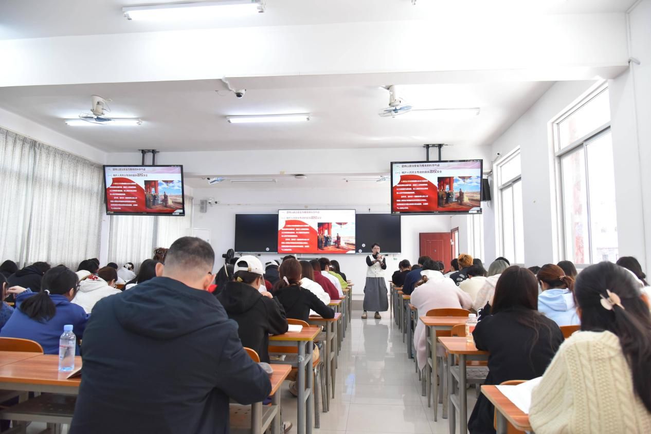 在專題授課環(huán)節(jié),陳寧春以《深入學習黨的二十屆四中全會精神 勇?lián)笆逦濉睍r代使命》為題,結(jié)合中國發(fā)展鮮活實踐與學生身邊可感可知的現(xiàn)實案例,從四大維度展開講解:一是“十四五”時期我國在經(jīng)濟、科技、民生等領域取得的標志性重大成就;二是“十五五”時期錨定高質(zhì)量發(fā)展、推進中國式現(xiàn)代化的重大戰(zhàn)略意義;三是黨的二十屆四中全會為國家未來發(fā)展擘畫的宏偉藍圖與實踐路徑;四是回顧學校高職辦學以來在“十四五”期間實現(xiàn)的跨越式發(fā)展與突破。陳寧春深入淺出解讀了政策內(nèi)涵,引導學生將個人成長與國家發(fā)展、時代需求緊密結(jié)合,深刻領會全會精神,樹立勇?lián)笆逦濉笔姑呢熑我庾R。