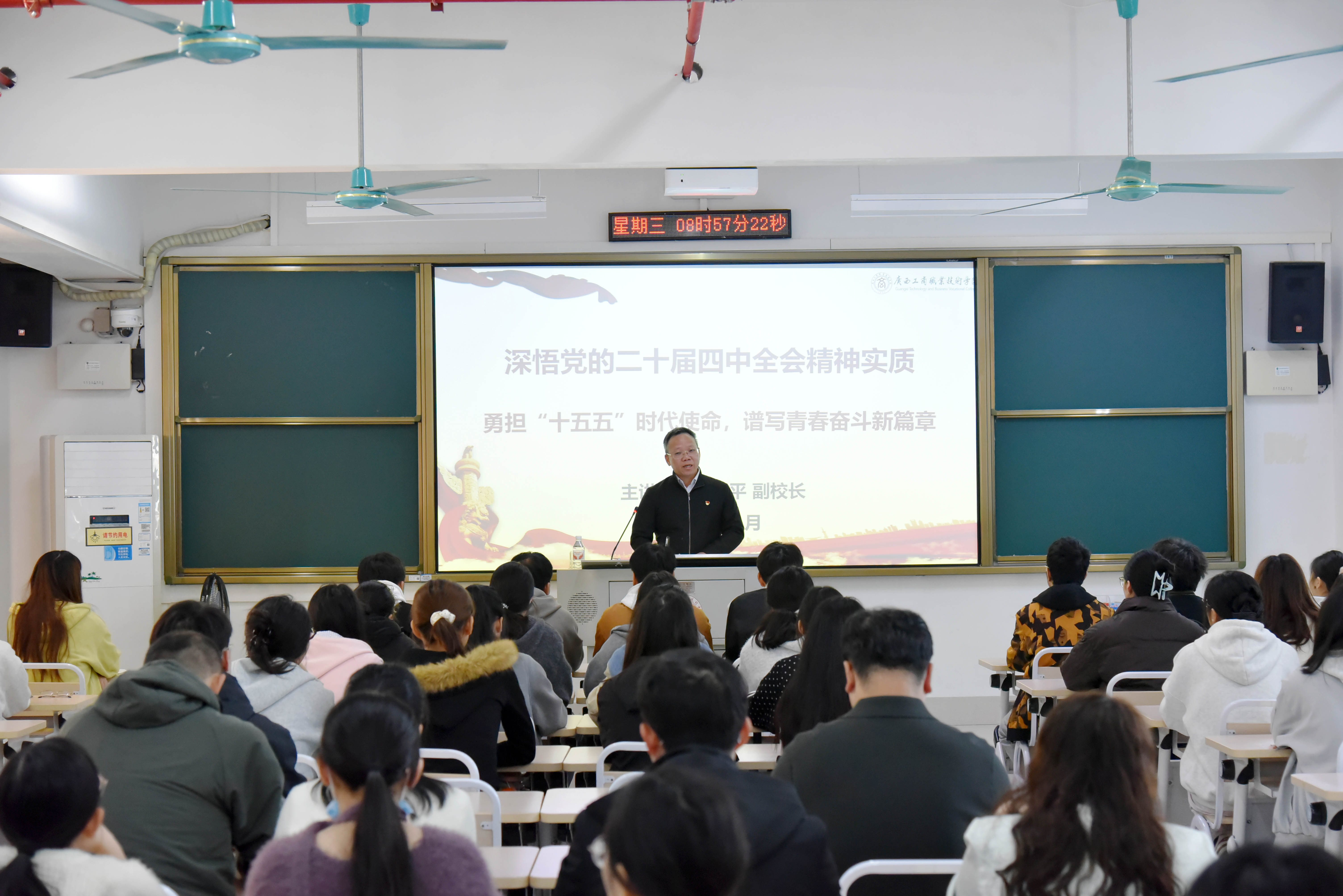 在專題授課中,闕勇平副校長(zhǎng)以《深悟黨的二十屆四中全會(huì)精神實(shí)質(zhì) 勇?lián)笆逦濉睍r(shí)代使命,譜寫青春奮斗新篇章》為題,從四個(gè)方面展開系統(tǒng)講解:一是回顧“十四五”時(shí)期我國(guó)發(fā)展取得的重大成就;二是闡釋“十五五”時(shí)期經(jīng)濟(jì)社會(huì)發(fā)展的重大意義;三是解讀黨的二十屆四中全會(huì)擘畫的未來(lái)藍(lán)圖;四是說(shuō)明黨的二十屆四中全會(huì)精神對(duì)大學(xué)生成長(zhǎng)成才的現(xiàn)實(shí)指引。授課過(guò)程中,他緊扣時(shí)代脈搏,將政策精神與社會(huì)現(xiàn)實(shí)相結(jié)合,用通俗易懂的語(yǔ)言幫助同學(xué)們準(zhǔn)確把握全會(huì)精神的核心要義,引導(dǎo)大家把人生理想融入強(qiáng)國(guó)建設(shè)、民族復(fù)興偉業(yè)的時(shí)代洪流,更加堅(jiān)定勇?lián)笆逦濉睍r(shí)代使命的信念與責(zé)任。