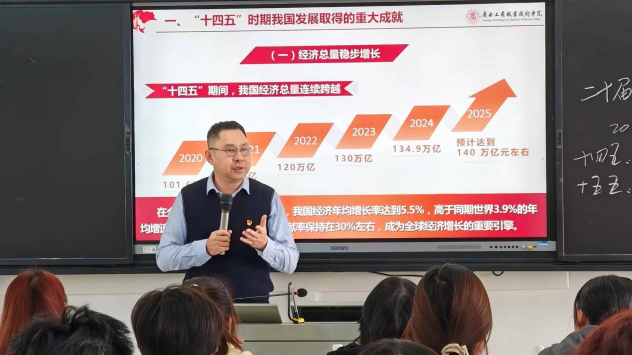 陳寧春立足學(xué)校辦學(xué)實踐,系統(tǒng)講述了近年來學(xué)校的發(fā)展成就和未來發(fā)展規(guī)劃,鼓勵青年一代要將個人理想融入國家發(fā)展大局,勇?lián)笆逦濉睍r代使命,加強(qiáng)知識學(xué)習(xí),夯實專業(yè)基礎(chǔ),在未來崗位上能發(fā)光發(fā)熱,用實際行動為學(xué)校增光,為實現(xiàn)《建議》擘畫的宏偉藍(lán)圖努力貢獻(xiàn)青春力量。