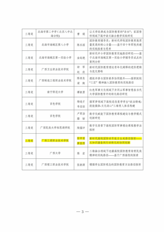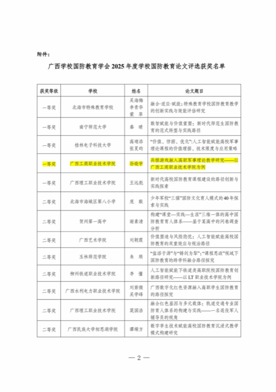 近日,廣西學(xué)校國防教育學(xué)會(huì)公布了2025年度學(xué)校國防教育論文評(píng)選結(jié)果,我校教師孫曉宇憑借論文《兵棋游戲融入高職軍事理論教學(xué)研究——以廣西工商職業(yè)技術(shù)學(xué)院為例》榮獲一等獎(jiǎng),張宇斐、廖顯圖老師的論文《新時(shí)代高校國防動(dòng)員能力生成路徑探析——從知識(shí)儲(chǔ)備到行動(dòng)轉(zhuǎn)化的協(xié)同創(chuàng)新》獲三等獎(jiǎng)。這一成績(jī)充分展現(xiàn)了我校在國防教育領(lǐng)域的創(chuàng)新實(shí)踐與理論研究實(shí)力,為推動(dòng)全區(qū)國防教育高質(zhì)量發(fā)展提供了寶貴經(jīng)驗(yàn)。