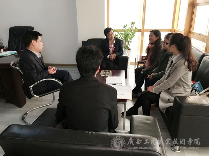 為了深化校企合作,加強我校學生頂崗實習過程管理,掌握學生頂崗實習狀況及企業(yè)對人才的需求。2015年12月22日上午,由教務(wù)科研處副處長謝偉燕老師領(lǐng)隊,經(jīng)管系就學副主任唐燕雯老師、經(jīng)管系就業(yè)秘書何麗瑩老師、財信系就業(yè)秘書莫凱淳老師等一行4人走訪了廣州多迪網(wǎng)絡(luò)科技有限公司南寧分公司、泰康人壽保險股份有限公司南寧分支公司2家企業(yè),檢查看望了學院2013級11名正在企業(yè)頂崗實習的學生。