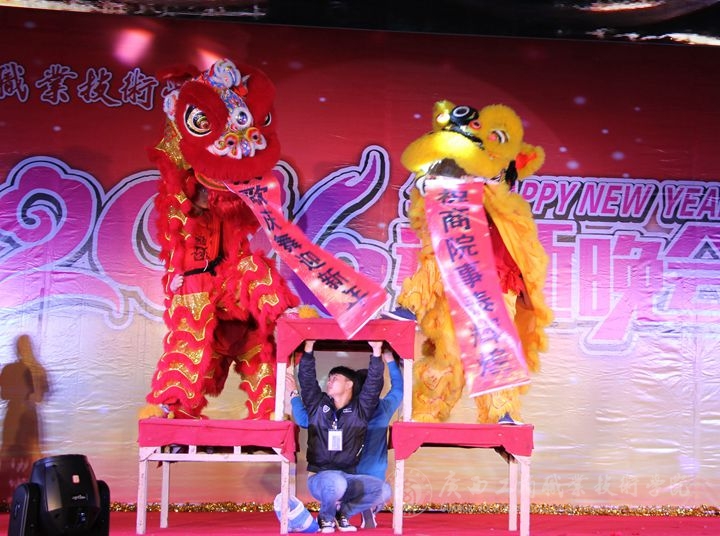 這次晚會開場首幕的是具有中國傳統(tǒng)文化特色的舞獅表演,覃武云書記為獅子現(xiàn)場“點睛”成為全場焦點,并為我院2016年許下“風(fēng)調(diào)雨順”的祝語,隨著主持人對各位來賓的介紹結(jié)束,就開始了如火如荼的精彩演出,舞蹈、走秀、唱歌、啞劇、瑜伽、武術(shù)這些展示無一不激動人心。其中,楊柳老師演唱的《紅土鄉(xiāng)》,婉轉(zhuǎn)而又不失氣魄,唱出了這首歌深沉的情感;一場《人生》的舞臺劇,每一個場景的切換,都深刻突出了這場話劇的主題;一首《好好說再見》,演繹出了精彩絕倫的青春之歌;一支《雨中花》的舞蹈,用靈活而柔韌的四肢,展現(xiàn)出了雨中的感情和意境;而優(yōu)雅的舞姿后面的節(jié)目,是大伙十分期待的重頭戲,武警總隊直屬支隊剛硬的擒拿武術(shù)表演,盡顯男兒本色;表演的最后,由學(xué)院大學(xué)生藝術(shù)團以一支《see you again》,動感十足、激情似火的舞蹈結(jié)束了本場晚會。