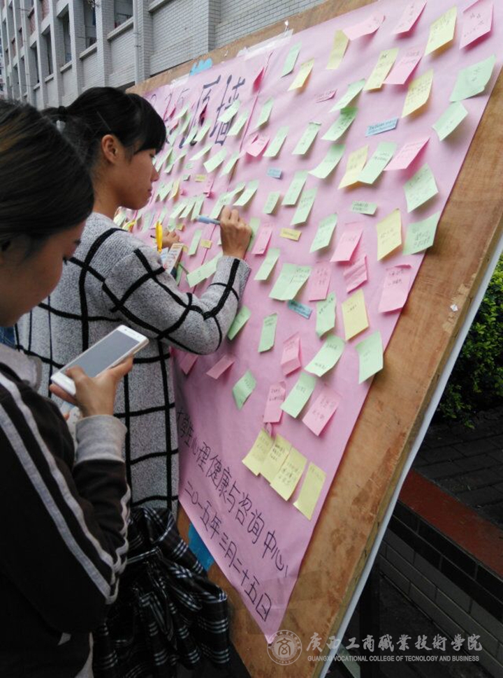 本次大學生心理健康與咨詢中心所舉行的現(xiàn)場宣傳活動吸引了很多同學的積極參與,他們或是認真觀看展板圖上的心理趣味圖、或是在心愿墻上美美的寫上自己心愿,或是興高采烈地領取充滿正能量的書簽或是在善愛自我,遠離網絡的橫幅上留下了自己的名字,活動還向全院同學們發(fā)出倡議 “生活離不開網絡,但網絡不是生活!”,各項活動得到了同學們的強烈響應,在簽名處擠滿了人,橫幅上密密麻麻的寫滿了字。同時本次活動設置了心理健康活動卡蓋章環(huán)節(jié),這是心理健康教育課程的一次創(chuàng)新。