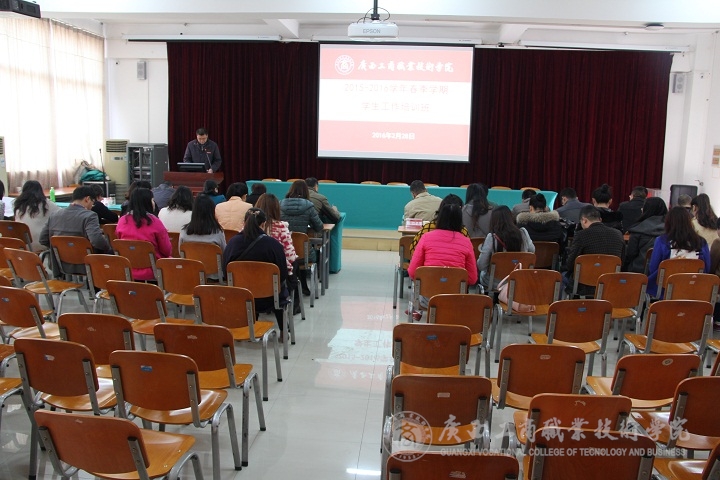2016年2月28日15:00,我院在校本部教學樓2145報告廳舉辦2015—2016學年寒假學生工作培訓班。學院黨委副書記蒙啟成、各系黨總支書記、系學工副主任、就業(yè)副主任、全體輔導員及學工處全體人員參加了培訓,由黨委學工部副部長張居設主持。