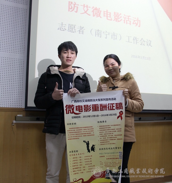 2016年3月13日上午10:00,廣西高校防艾微電影大賽組委會(huì)在廣西衛(wèi)生職業(yè)技術(shù)學(xué)院召開相關(guān)志愿者組長(zhǎng)工作會(huì)議,我院黨委宣傳部新聞中心的同學(xué)積極參與了會(huì)議。