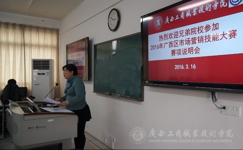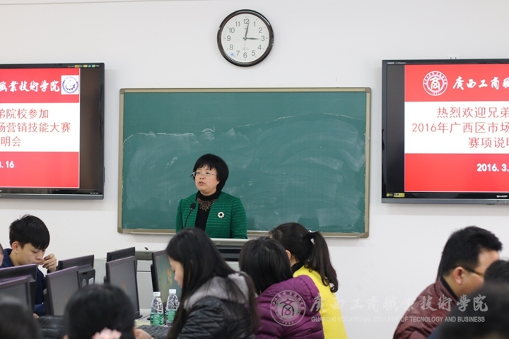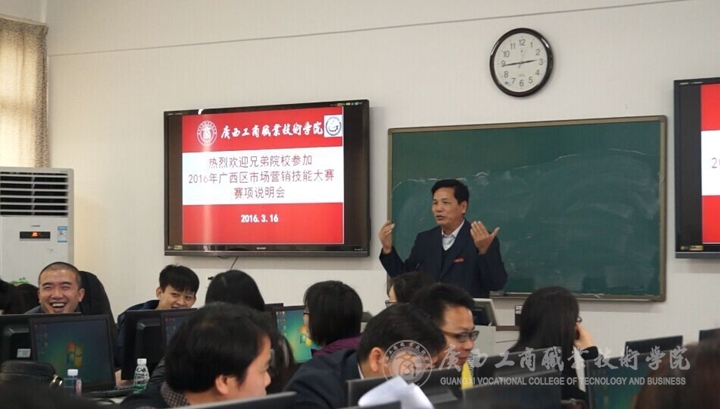 2016年3月16日14時(shí), 2016年廣西職業(yè)院校技能大賽高職組市場營銷技能賽項(xiàng)說明會在我院本部教學(xué)樓2511教室舉行。學(xué)院教務(wù)科研處處長韋勝強(qiáng)教授、經(jīng)管系譚波主任、高職研究所副所長葉桂中教授和來自全區(qū)大部分參賽院校領(lǐng)隊(duì)和指導(dǎo)教師、營銷技能競賽技術(shù)支持單位代表共40多人參加了賽項(xiàng)說明會。