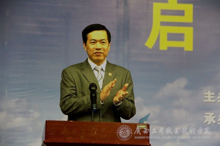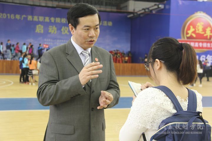 廣西工商職業(yè)技術(shù)學(xué)院陳杰院長在臺上發(fā)表講話。他代表學(xué)院全體師生向出席此次活動(dòng)的領(lǐng)導(dǎo)和代表們致以衷心的感謝和熱烈的歡迎,并向大家介紹了廣商院的教育體系和發(fā)展?fàn)顩r。陳杰院長表示,廣商院承辦2016年廣西高職高專院校招生宣傳“大篷車”活動(dòng),將以此為契機(jī),銳意改革創(chuàng)新,以建設(shè)廣西同類領(lǐng)先,財(cái)經(jīng)特色鮮明的應(yīng)用型高等職業(yè)院校為目標(biāo),不斷提高人才培養(yǎng)質(zhì)量;以服務(wù)廣西區(qū)域經(jīng)濟(jì)和社會發(fā)展為抓手,積極開展教育教學(xué)、科學(xué)研究和社會服務(wù),為我區(qū)推進(jìn)文化傳承與創(chuàng)新、促進(jìn)社會現(xiàn)代化建設(shè)與發(fā)展貢獻(xiàn)一份力量。