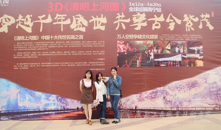2016年3月20日上午,為了感受中國古典藝術(shù)氣息的熏陶,為了豐富同學(xué)們的課余生活,我院新聞中心的同學(xué)們自發(fā)組織穿越大半個(gè)南寧去到了南寧市五象新區(qū)萬達(dá)茂觀看“3D版清明上河圖”,讓我們真真切切的感受到了中國國寶級(jí)名畫、十大傳世名畫之首的《清明上河圖》3D巨幅長(zhǎng)卷所帶來的震撼。