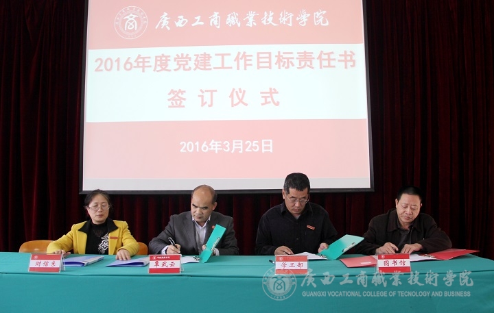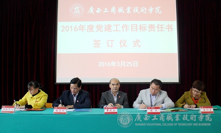 在會上,簽訂了學(xué)院《2016年度黨建工作目標(biāo)責(zé)任書》和《2016年黨風(fēng)廉政建設(shè)責(zé)任書》。首先是各部門負(fù)責(zé)人與學(xué)院黨委書記覃武云簽訂《2016年度黨建工作目標(biāo)責(zé)任書》。隨后,各部門負(fù)責(zé)人再次與學(xué)院黨委書記覃武云,學(xué)院黨委副書記、院長陳杰簽訂《2016年黨風(fēng)廉政建設(shè)責(zé)任書》。