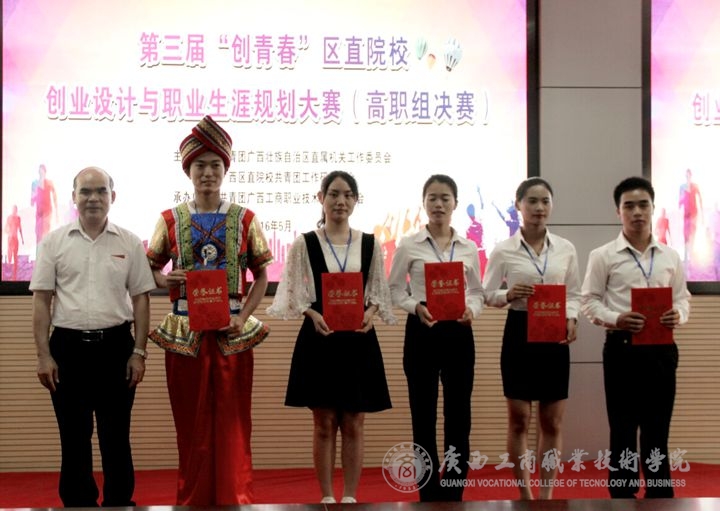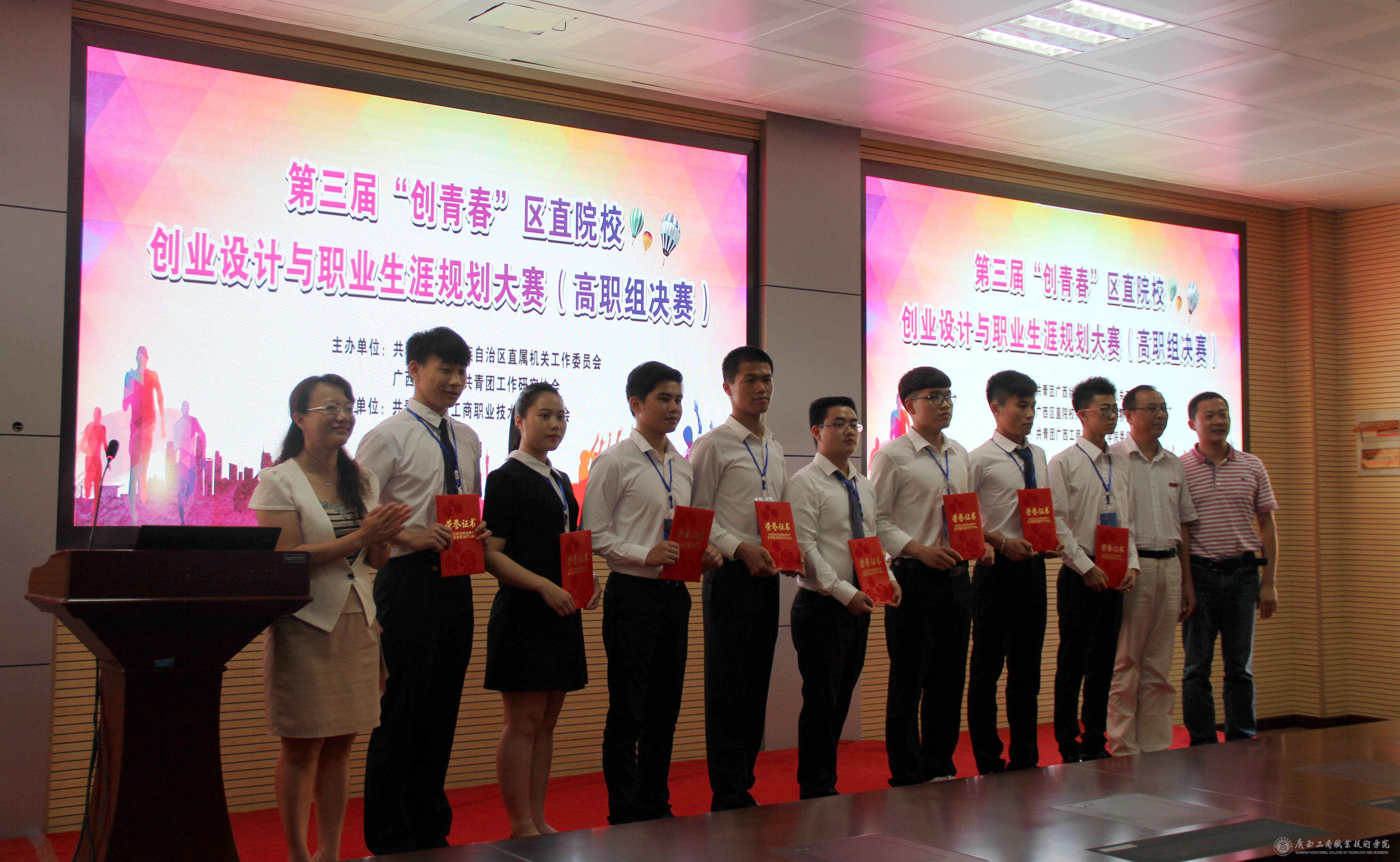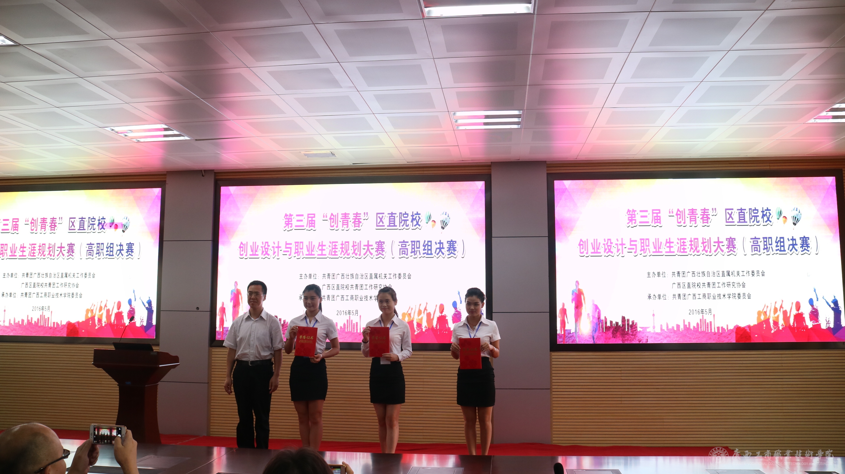 至決賽尾聲,由共青團(tuán)廣西區(qū)委副書記劉玄啟和我院黨委書記覃武云分別給榮獲一等獎(jiǎng)、二等獎(jiǎng)的選手頒獎(jiǎng),我院黨委副書記、紀(jì)委書記蒙啟成、自治區(qū)直屬機(jī)關(guān)團(tuán)工委書記謝萍、共青團(tuán)廣西區(qū)委學(xué)校部部長(zhǎng)鐘聲宇為榮獲三等獎(jiǎng)的選手頒獎(jiǎng)。2016年第三屆“創(chuàng)青春”區(qū)直院校、創(chuàng)業(yè)設(shè)計(jì)與職業(yè)生涯規(guī)劃大賽決賽圓滿落下帷幕!
