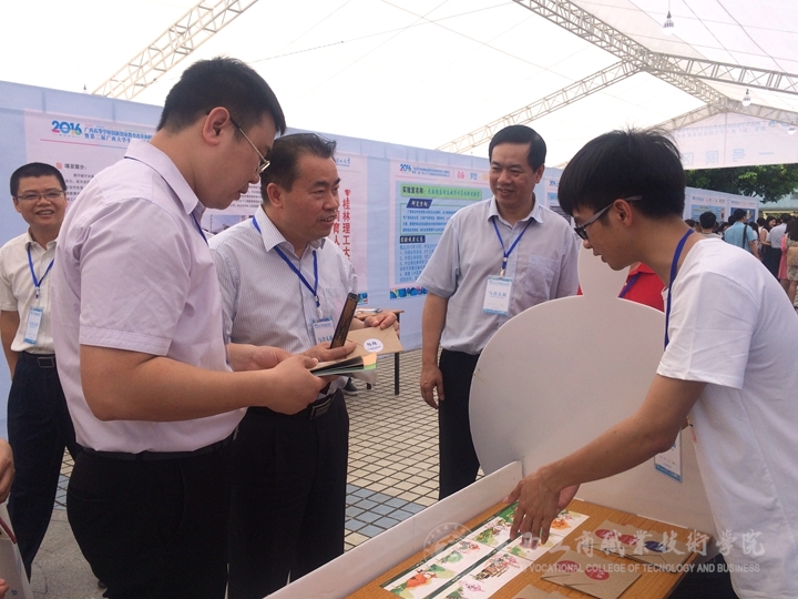 2016年5月7日,由自治區(qū)教育廳主辦的廣西高等學(xué)校創(chuàng)新創(chuàng)業(yè)教育改革和轉(zhuǎn)型發(fā)展工作推進(jìn)會(huì)暨第二屆廣西大學(xué)生創(chuàng)新創(chuàng)業(yè)優(yōu)秀成果展示會(huì)在廣西財(cái)經(jīng)學(xué)院舉行。教育部高教司理工處處長(zhǎng)吳愛(ài)華、貴州大學(xué)校長(zhǎng)鄭強(qiáng)教授應(yīng)邀到會(huì)作專題報(bào)告,自治區(qū)高校工委書(shū)記、教育廳廳長(zhǎng)秦斌,教育廳副廳長(zhǎng)蔡昌卓,來(lái)自全區(qū)50余所高等院校的領(lǐng)導(dǎo)、師生代表和校企合作單位代表參加了會(huì)議相關(guān)活動(dòng)。