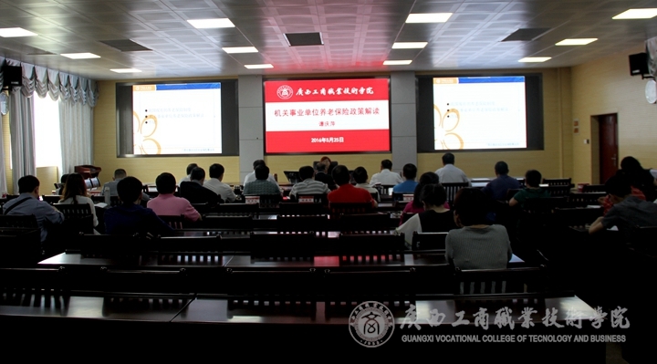 2016年5月25日下午,我院在校本部2119會議室舉辦機(jī)關(guān)事業(yè)單位養(yǎng)老保險政策解讀專題講座。學(xué)院黨委書記覃武云、院長陳杰、黨委副書記蒙啟成、副院長李仕欽、副院長李維、學(xué)院中層以上領(lǐng)導(dǎo)及業(yè)務(wù)部門工作人員參加了本次講座。本次講座由自治區(qū)社保局基本養(yǎng)老保險經(jīng)辦管理處主任科員譚慶萍主講。
