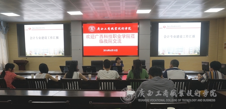2016年6月15日上午,廣西科技職業(yè)學(xué)院院長助理吳先夏等一行11名教師到我院進行交流。學(xué)院領(lǐng)導(dǎo)、會計專業(yè)帶頭人、工商企業(yè)管理專業(yè)帶頭人、計算機專業(yè)帶頭人、物流專業(yè)帶頭人、各系教學(xué)秘書及教務(wù)科研處相關(guān)人員參加了交流活動。