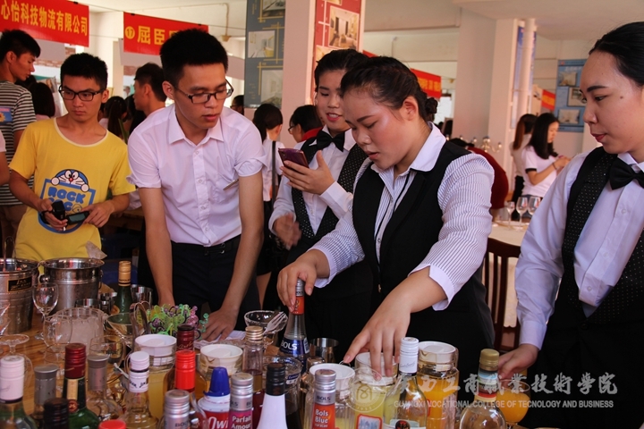 就業(yè)洽談會上,還安排了廣商院系列教學(xué)成果展演。酒店管理專業(yè)學(xué)生的西餐擺臺、中餐擺臺、餐巾花折疊、調(diào)酒表演等表演既展示出學(xué)生嫻熟的專業(yè)技能,也體現(xiàn)學(xué)院嚴(yán)謹(jǐn)專業(yè)的教學(xué)。同時,會計系學(xué)生在學(xué)生公寓架空層展示點鈔、珠算的技能,嫻熟的珠算打法,撥動的算珠敲擊著算盤框,聲聲連珠陣陣響,學(xué)生低頭認(rèn)真點鈔,速度手法技巧令人折服。除此之外,書法與攝影作品展示,字跡工整,現(xiàn)場書法,吸引觀眾踴躍嘗試,題詞留下筆墨。學(xué)生各社團(tuán)紛紛展示才藝,各展特色。