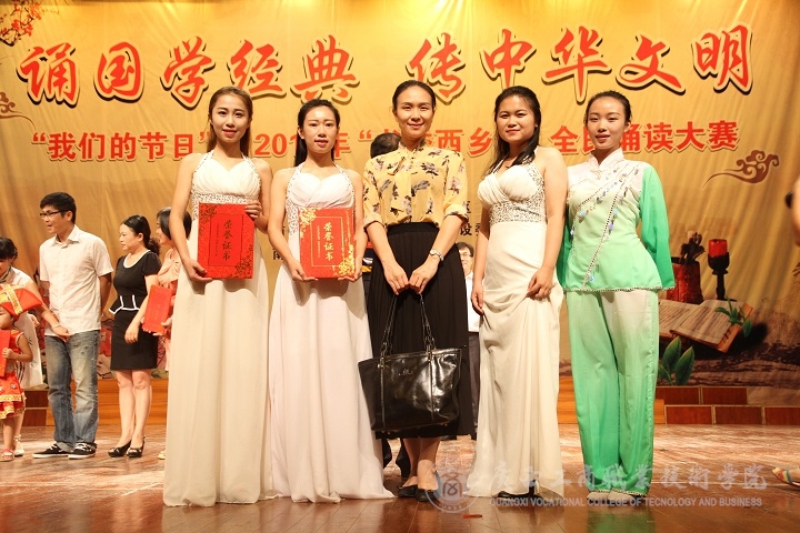 2016年6月16日,在廣西財經(jīng)學院舉辦中共南寧市西鄉(xiāng)塘區(qū)委宣傳部、南寧市西鄉(xiāng)塘區(qū)精神文明建設委員會、南寧市西鄉(xiāng)塘區(qū)總工會主辦“誦國學經(jīng)典,傳中華文明”的比賽。由我院公共基礎部梁曉霞老師率隊,帶領學院韋思凡、吳梅蓮、覃蕾三名同學參加比賽。在國家級普通話測試員梁曉霞老師的指導下,我院參賽選手詩朗誦朱自清《春》,取得以9.52分的成績,奪得此次比賽的一等獎。