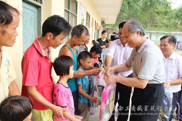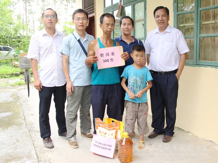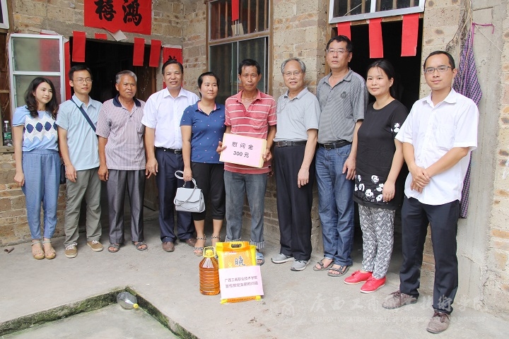 2016年7月8日,學(xué)院黃永蓬副廳級調(diào)研員率黨委宣傳部部長韋勝強、后勤管理處處長付光、宣傳部黨員教師等一行五人前往陸川縣看望駐四樂村第一書記羅北戰(zhàn)同志,走訪慰問該村老黨員、困難黨員、困難群眾,并為當(dāng)?shù)匦W(xué)困難學(xué)子捐獻學(xué)習(xí)用品。