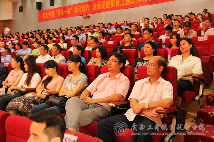 為弘揚(yáng)柏鄉(xiāng)糧庫(kù)精神,深化糧食行業(yè)文化建設(shè),深入開展“兩學(xué)一做”學(xué)習(xí)教育,9月20日,自治區(qū)糧食局邀請(qǐng)了全國(guó)糧食系統(tǒng)先進(jìn)典型——河北柏鄉(xiāng)糧庫(kù)先進(jìn)事跡宣講團(tuán)來廣西南寧宣講,我院李維副院長(zhǎng)、各單位、各部門科級(jí)以上干部代表及各系學(xué)生代表聆聽了報(bào)告。