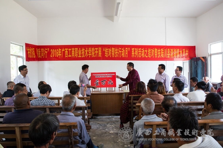 下午15時,在經(jīng)過7個多小時的長途跋涉后,我院幫扶對順利抵達水亭村與我院派駐水亭村掛職的第一書記譚爵璽老師和水亭村兩委干部匯合,隨后我院教職工不顧舟車勞頓立即組織開展“結(jié)對幫扶”活動,會上,我院派駐水亭村第一書記譚爵璽老師就2016年水亭村脫貧攻堅工作情況向?qū)W院領(lǐng)導(dǎo)和教職工做了簡要匯報,付光處長宣布了學(xué)院開展“結(jié)對幫扶行動月”系列活動之結(jié)對幫扶水亭村的活動正式啟動并對活動如何開展進行了布置安排,隨后和林雯主任一同代表學(xué)院向水亭村村委捐贈精準(zhǔn)扶貧工作經(jīng)費一萬元整。清湖鎮(zhèn)副鎮(zhèn)長劉奇桂同志在會上代表清湖鎮(zhèn)黨委和政府感謝我院對水亭村精準(zhǔn)扶貧工作的大力支持和無私幫助。