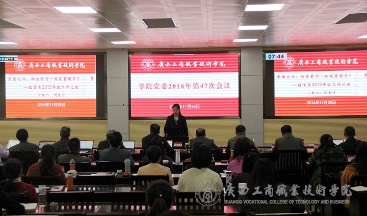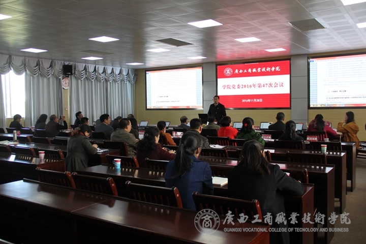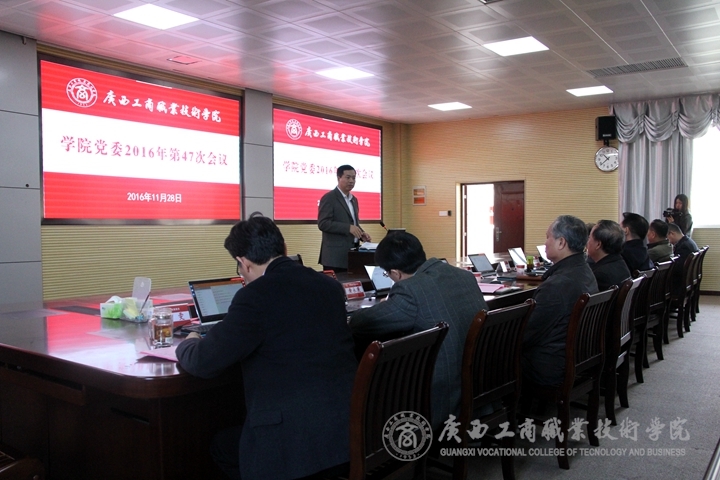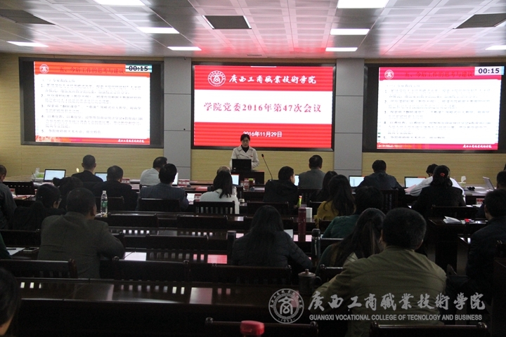 2016 年 11 月 28 日全天、29日下午,我院在校本部2119視頻會(huì)議室召開第47次黨委會(huì),聽取我院教改和教師專題匯報(bào)。學(xué)院黨委書記覃武云、黨委副書記、院長(zhǎng)陳杰、黨委副書記、紀(jì)委書記蒙啟成、黨委委員、副院長(zhǎng)李仕欽、黨委委員、副院長(zhǎng)李維、學(xué)院副廳級(jí)調(diào)研員黃永蓬、黨委委員、副院長(zhǎng)陳寧春出席會(huì)議,蔣百平、覃超穎、林雯等三位黨委委員共同參會(huì)。